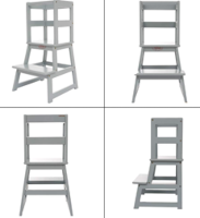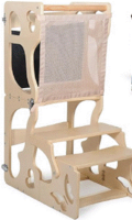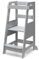 Bauhini SDADI Kitchen Step Stools are wooden standing towers for kids. They are about 35 inches high, 18 inches wide, and 18 inches deep. The towers were sold in grey, white, and natural wood colors.