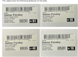 The Italian Parsley was shipped to wholesalers in AZ, CA, FL, MN, MI, GA, OH and NV between September 22 and September 25, 2025. The bulk Parsley was sold in cases as 30 or 60 bunches with a twist tie, and in 24 ct bunches with a twist tie in bags intended for wholesale distribution. The UPC for the 30 and 60 ct bunched Italian Parsley is 40695 80125, located on the twist tie. The UPC for the 24 ct bags is 40695 80120. The shelf life of Italian Parsley is 18 days from harvest, or October 10, 2025.